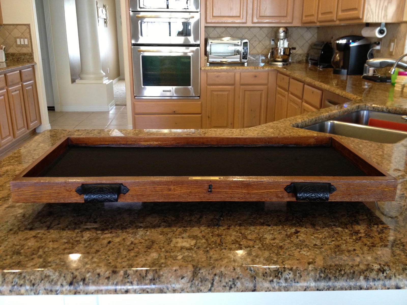 I know...a drawer is not much to share, and I can say that the picture does not really do my efforts justice, but at least you get an idea. I am using the existing hardware, painted black. A few of the drawers had been lined with green felt...it was so old that it practically disintegrated as I was removing it. Now she gets a new black felt liner, cuz' nothing says sexy like black does!